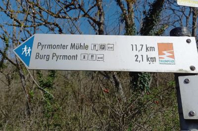 Hoch oben, über dem Wanderparkplatz an der Pyrmonter Mühle, thront sie. Die Burg Pyrmont und Namensgeberin des prämierten Wanderwegs. Der Frühlingstag hätte nicht schöner beginnen können. Am stahlblauen Himmel setzen sich die historischen Gemäuer der großen mittelalterlichen Burganlage malerisch ab. Trotz des schönen Wetters sind nur wenige Mitwanderer vor Ort. Es sind heftige Schauer angekündigt, also keine Zeit verlieren und den Rucksack aufsetzen, vier Stunden sind für die Wanderung vorgegeben.