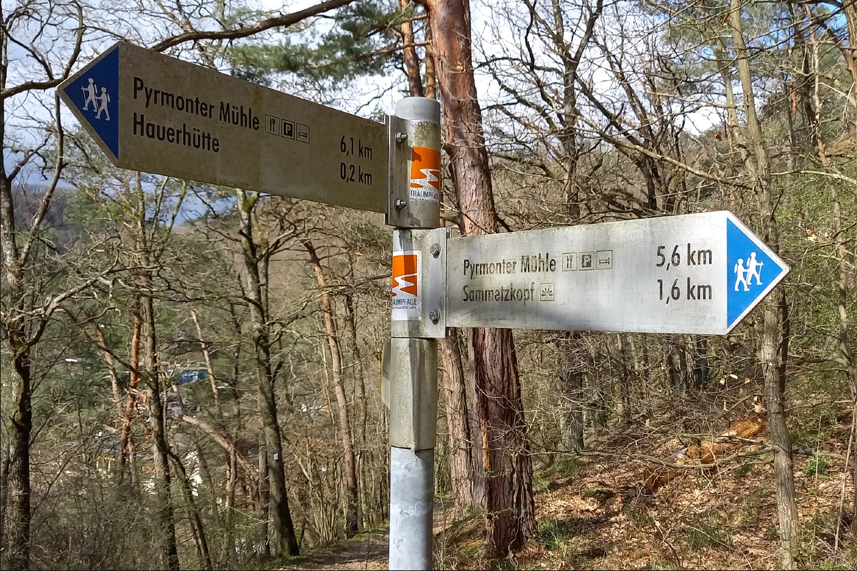 Der „Pyrmonter Felsensteig“ ist einer der 27 Traumpfade. Start und Ziel des „schönsten Wanderweges Deutschlands 2015“ ist der Parkplatz an der Pyrmonter Mühle in 56754 Roes. Sollte der Parkplatz voll sein, gibt es unweit an der Burg weitere Möglichkeiten sein Auto zu parken. Wie alle Traumpfade, ist auch dieser Weg ein Rundweg mit einer Weglänge von rund 12 Kilometer, für die man rund vier Stunden einplanen sollte. Essen und Trinken nicht vergessen einzupacken, da es am Weg keine Gastronomie gibt. Der Weg ist mit der Schwierigkeit „Mittel“ bewertet, also auch für Familien mit älteren Kindern (ab 10 Jahren) geeignet. Im Aufstieg/Abstieg hat man jeweils 363 Höhenmeter zu bewältigen. Anfahrt über die A61 und A48 (Abfahrt Kaifenheim). Weiter über die L 109 Richtung Burg Pyrmont nach Roes und der K 27 Richtung Burg Pyrmont bis zur Pyrmonter Mühle. Die Ausfahrt zum Parkplatz liegt in einer Kurve.