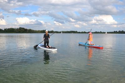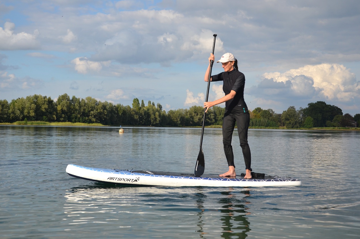 Es gibt kleine Kniffe und Tricks, die man kennen sollte. Auch aus Sicherheits-Aspekten. Dann macht es mehr Spaß, wenn man weiß, wie es geht“, so Katharina. Ein SUP-Einsteigerkurs, der rund eineinhalb Stunden dauert, fängt auf dem Trockenen an. Zunächst wird die Hardware erklärt: das Board und Paddel. Wie groß das SUP-Board sein sollte, hängt von Größe und Gewicht ab. Generell gilt: je größer und breiter, desto stabiler und weniger wackelig sind die Bretter. Ein häufiger Anfängerfehler ist der Kauf eines zu kleinen Brettes. Kleine, leichte Bretter sind zu instabil. Angebote bei Discountern sind häufig Bretter für Kinder und Jugendliche. Beim Kauf also auf ein großes Allroundbrett achten, die es schon für 300 bis 400 Euro gibt. Wichtig ist beim Aufbau des Brettes, die Finne nicht zu vergessen. Diese ist für eine ruhige Laufrichtung und Stabilität unverzichtbar. Die Finne muss hinten (!) am Brett angebracht sein. Ganz wichtig ist, dass man genug Luft im SUP hat. Immer so viel Aufpumpen, wie empfohlen. Die Richtwerte findet man am Ventil. Lagern sollte man ein Brett nie in der Sonne und immer etwas Luft rauslassen, sonst könnte es platzen. Letztes Tool ist das Paddel. Bei allen Boards ist ein Paddel dabei. Die Standardpaddel sind allerdings schwer und oft minderwertig. Wer Spaß am SUPen hat, sollte sich als zweiten Schritt ein besseres Paddel kaufen das leichter ist, zum Beispiel mit einem Carbonstil.